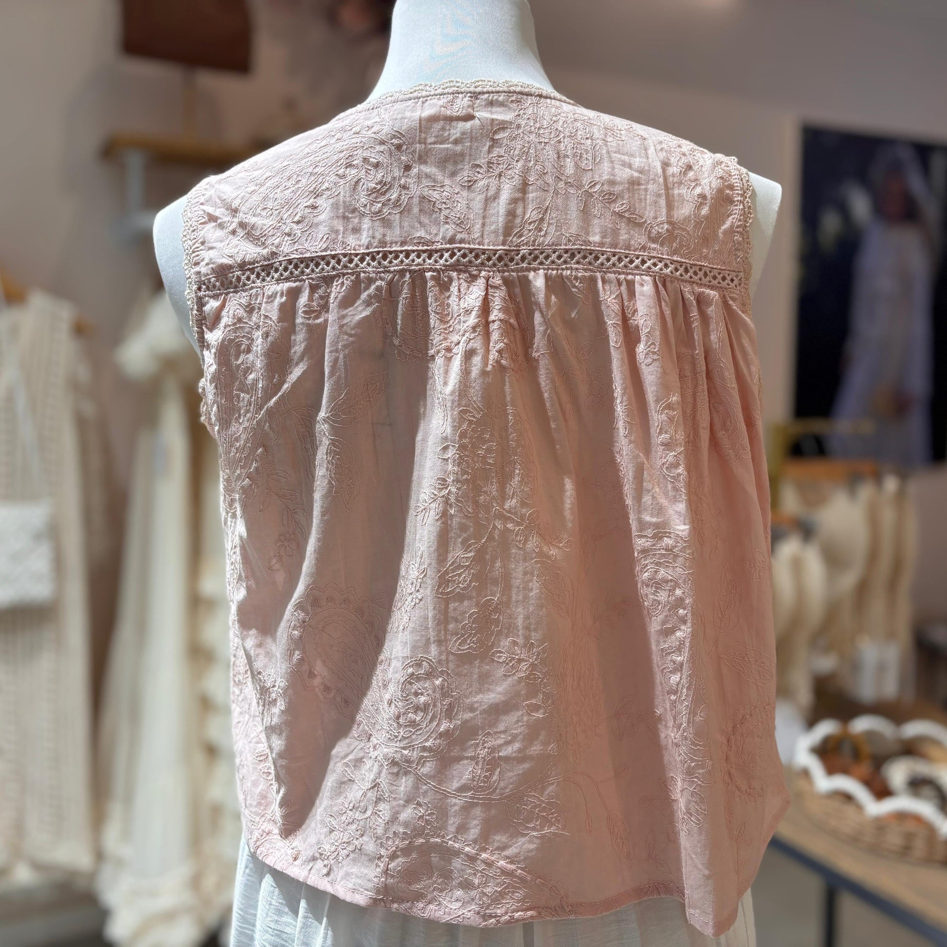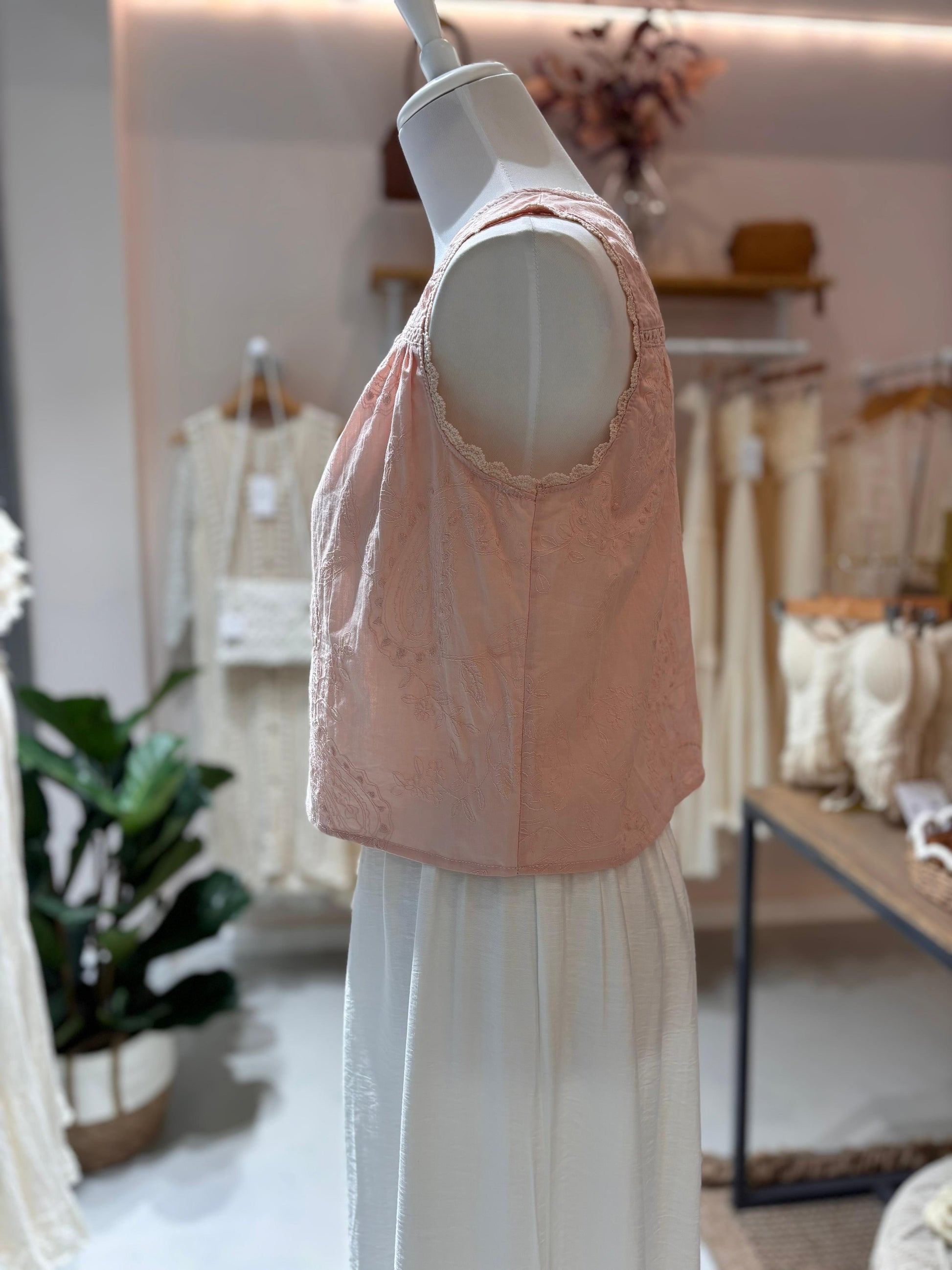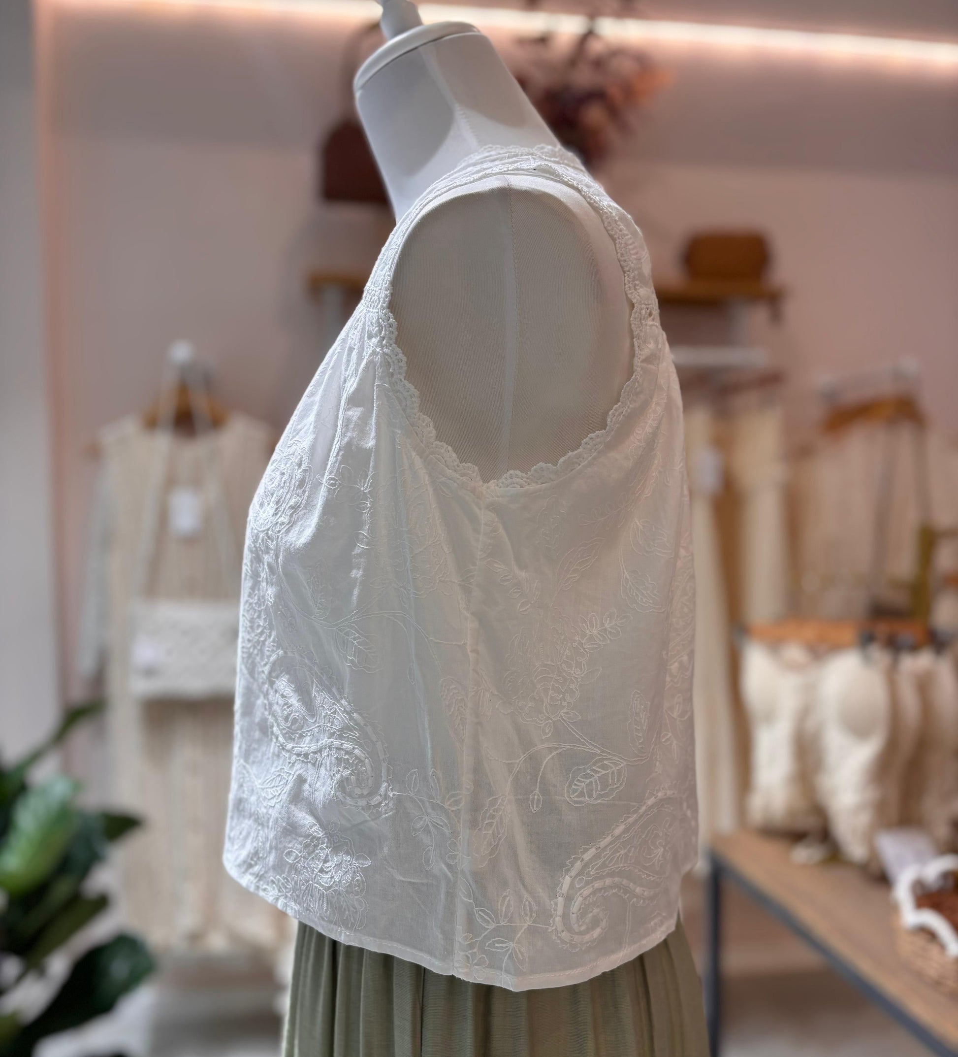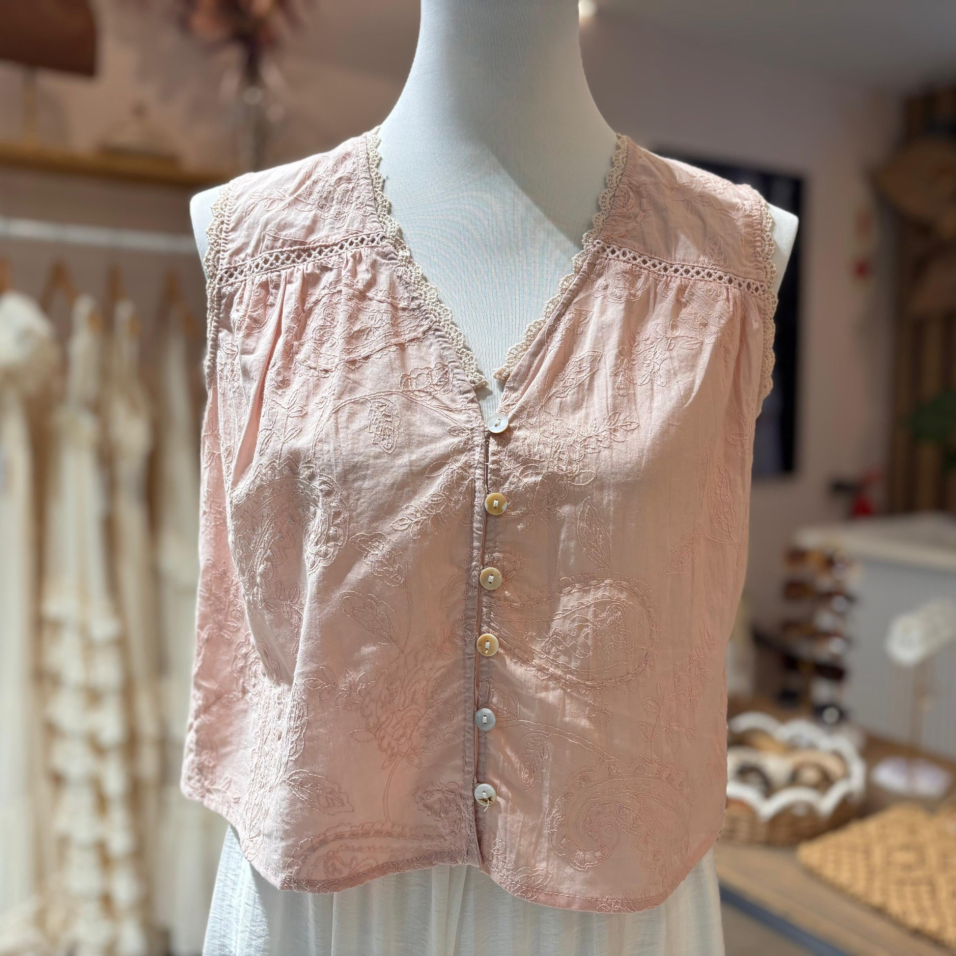 The Camille Top features delicate textured detailing, a flattering sleeveless cut and functional front buttons for easy styling. Lightweight and breathable, it’s perfect for warm days and pairs beautifully with skirts, linen pants or denim.