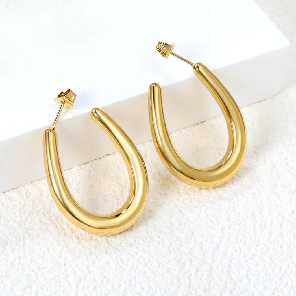 Minimalist design with bold impact. The Maleia Earrings feature a modern open hoop silhouette with a smooth, sculpted finish. Crafted from stainless steel and coated in 18K gold, they’re built to shine through every occasion—beach days, workouts, or date nights. Waterproof, tarnish-resistant, and hypoallergenic for everyday wear without compromise.