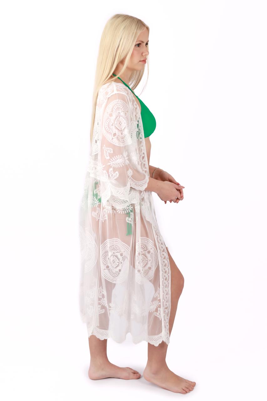 Elevate your style with this elegant lace kimono. Perfect for layering over swimwear at the beach or poolside, it adds a touch of sophistication to your sun-kissed look.