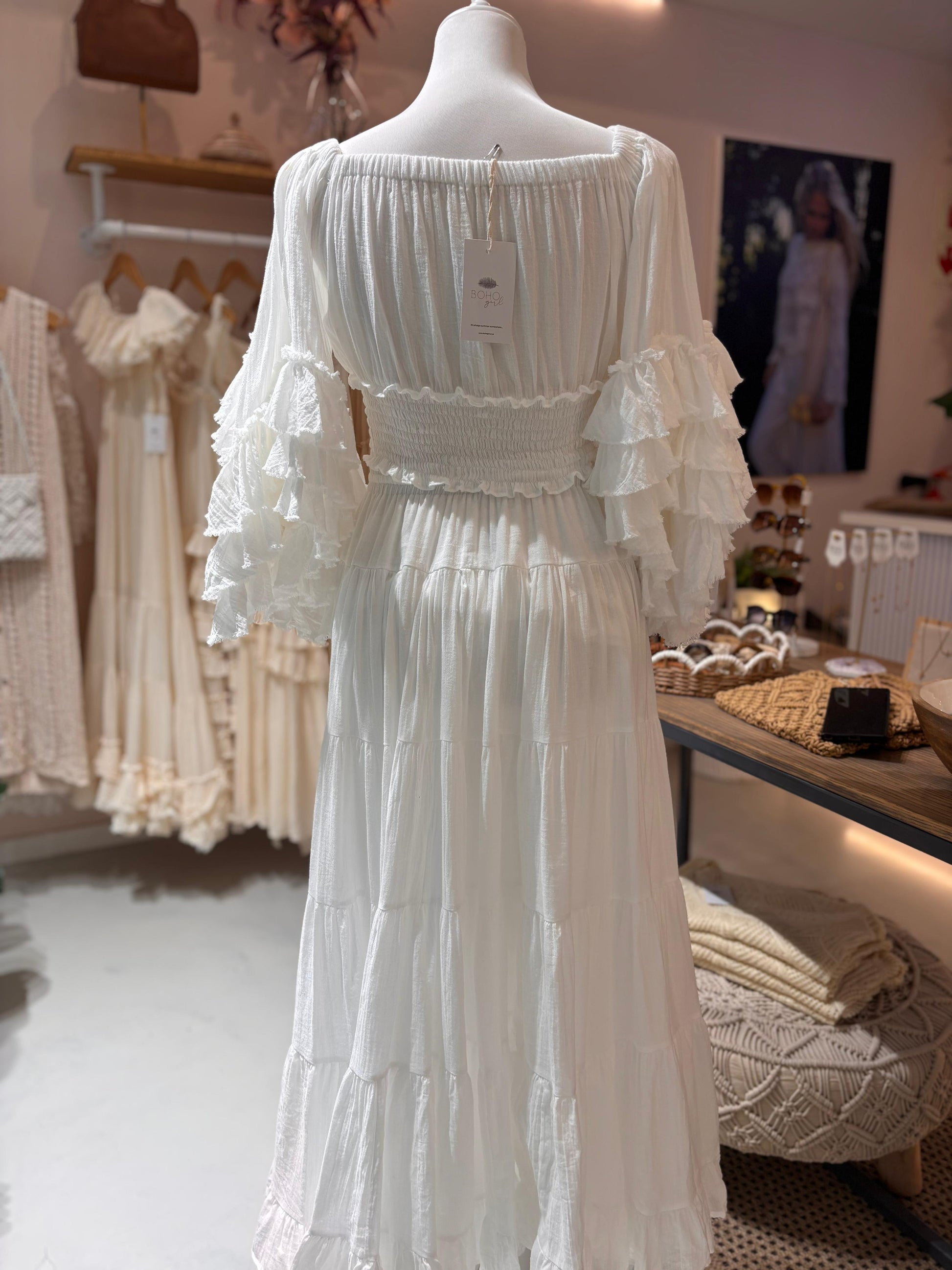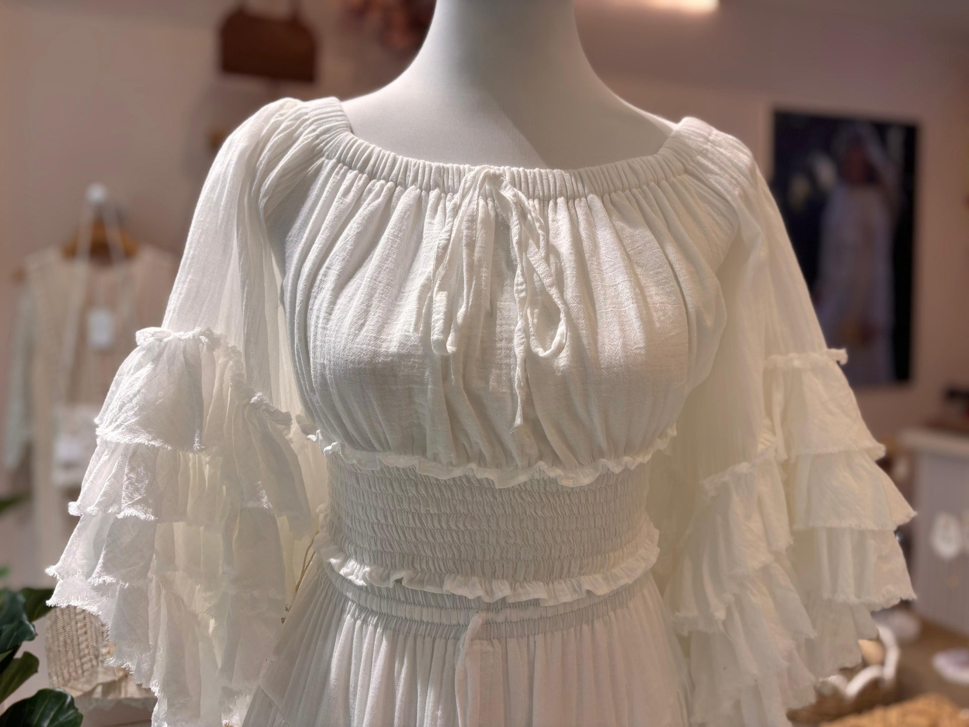 Featuring a softly gathered neckline, elasticated shirred waist and delicate layered sleeves, this top creates a beautiful, floaty silhouette while still defining your shape. The lightweight textured fabric makes it perfect for warm days, holidays or special occasions.